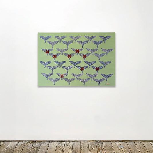Under the name GOS Lab (Green Ocean Surfing Laboratory), Fabio frames his work as both homage and offering—to the sea, and to the consciousness he hopes it can awaken. His compositions often draw from ancestral symbols, minimalist forms, and meditative mark-making rooted in Aboriginal dot painting. Yet in his hands, they become microcosms of waves, droplets, and living movement.