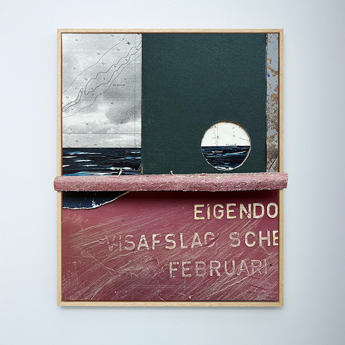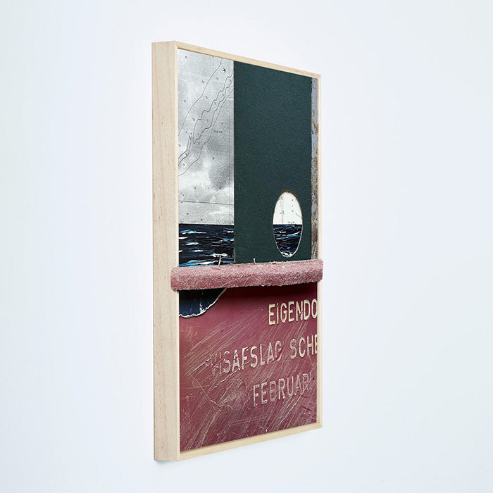 Dim Rooker, born in 1972 in The Netherlands, creates mixed media collages that reflect the space and atmosphere of his hometown, Scheveningen. His raw graphical compositions, crafted from items collected along the shoreline, infuse his work with a profound sense of adventure, evoking the exploration of coastlines and the sea.