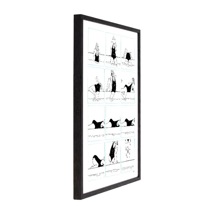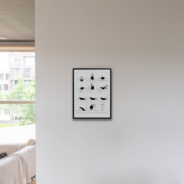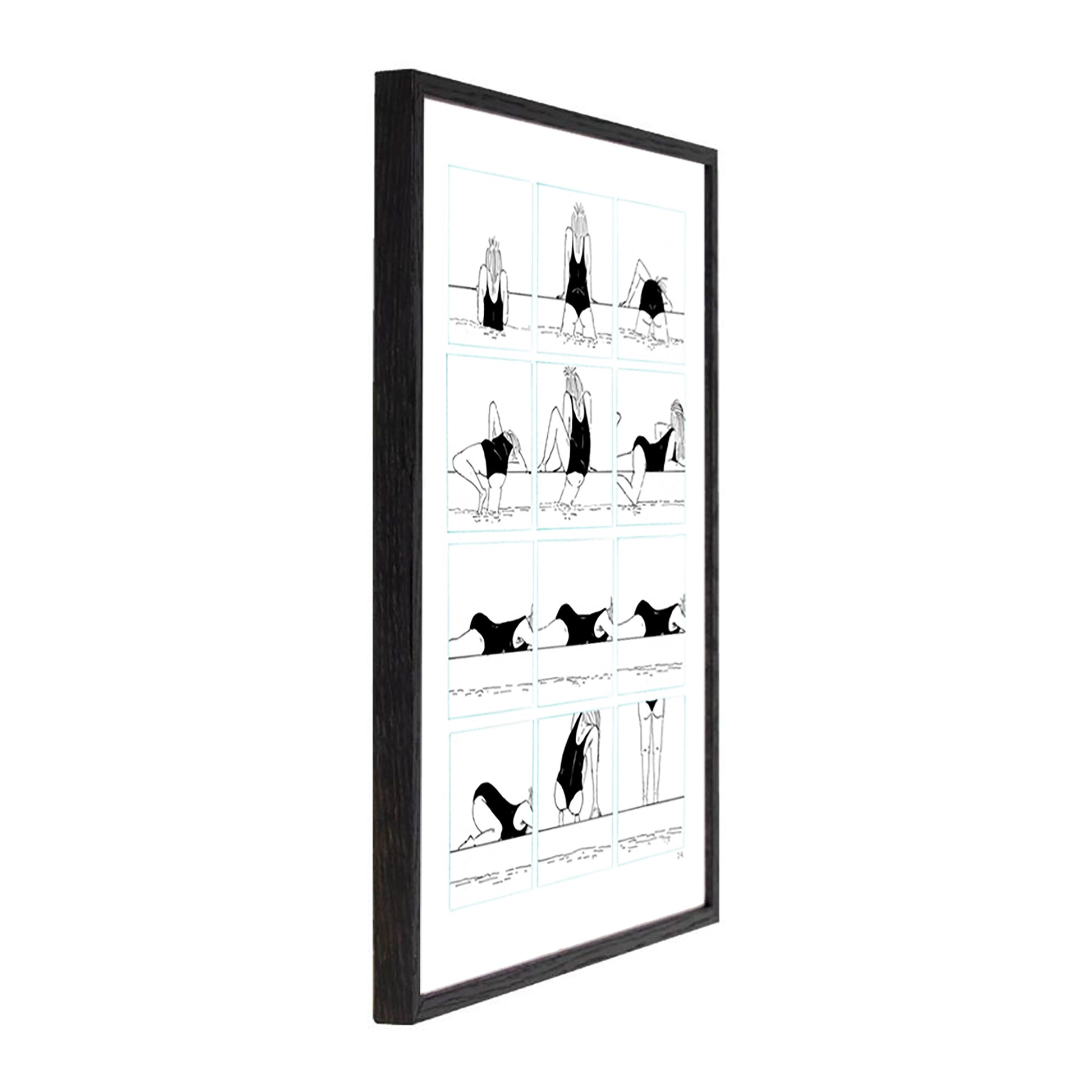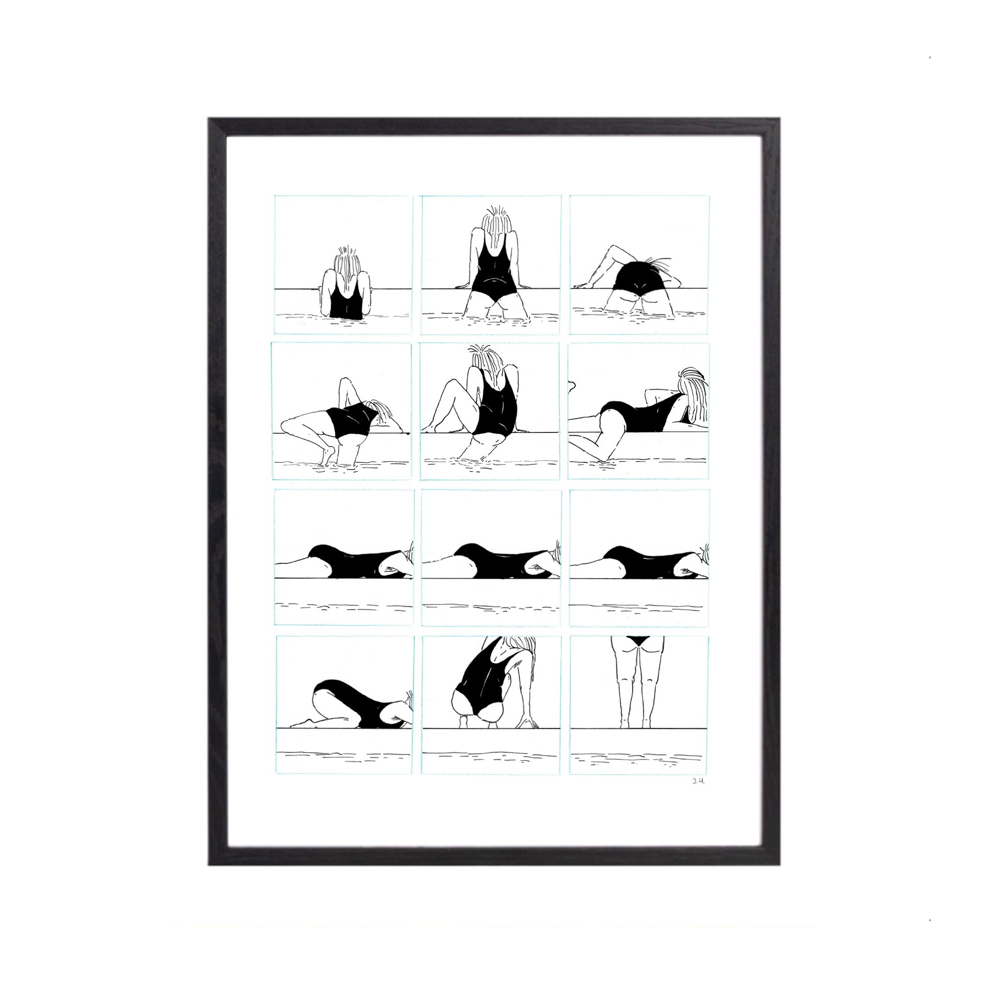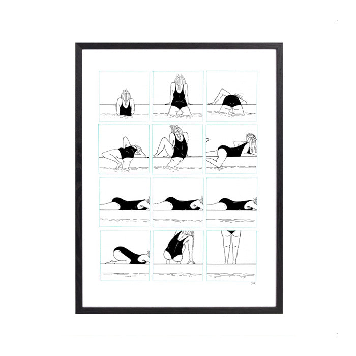 POOLDANCE is an illustration by Jente Hoogeveen. It's part of the 'muscle memory' series. This piece is available as a giclée print on Hahnemuhle art paper, and framed in a thin solid wooden frame. The work, shown here in A3 format, is an open edition, signed by the artist, and is ready to hang.